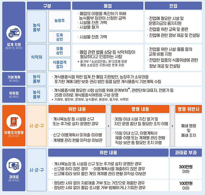 개식용종식법은 개사육 농장과 식품접객업자들에게 폐업 및 전환을 지원하는 구체적인 방안을 제시하고 있습니다. 정부는 개사육 농장의 폐업을 장려하기 위해 시설 철거 및 잔존가액 보상, 전업을 위한 융자 및 재교육 프로그램 등을 제공할 예정입니다. 또한, 개고기를 취급하던 식품접객업자들에게는 소상공인 보호 및 지원 법률에 따른 법률 상담 및 지원을 제공합니다. 이를 통해 개고기 산업에 종사하던 이들이 다른 산업으로 원활히 전환할 수 있도록 돕고자 합니다.